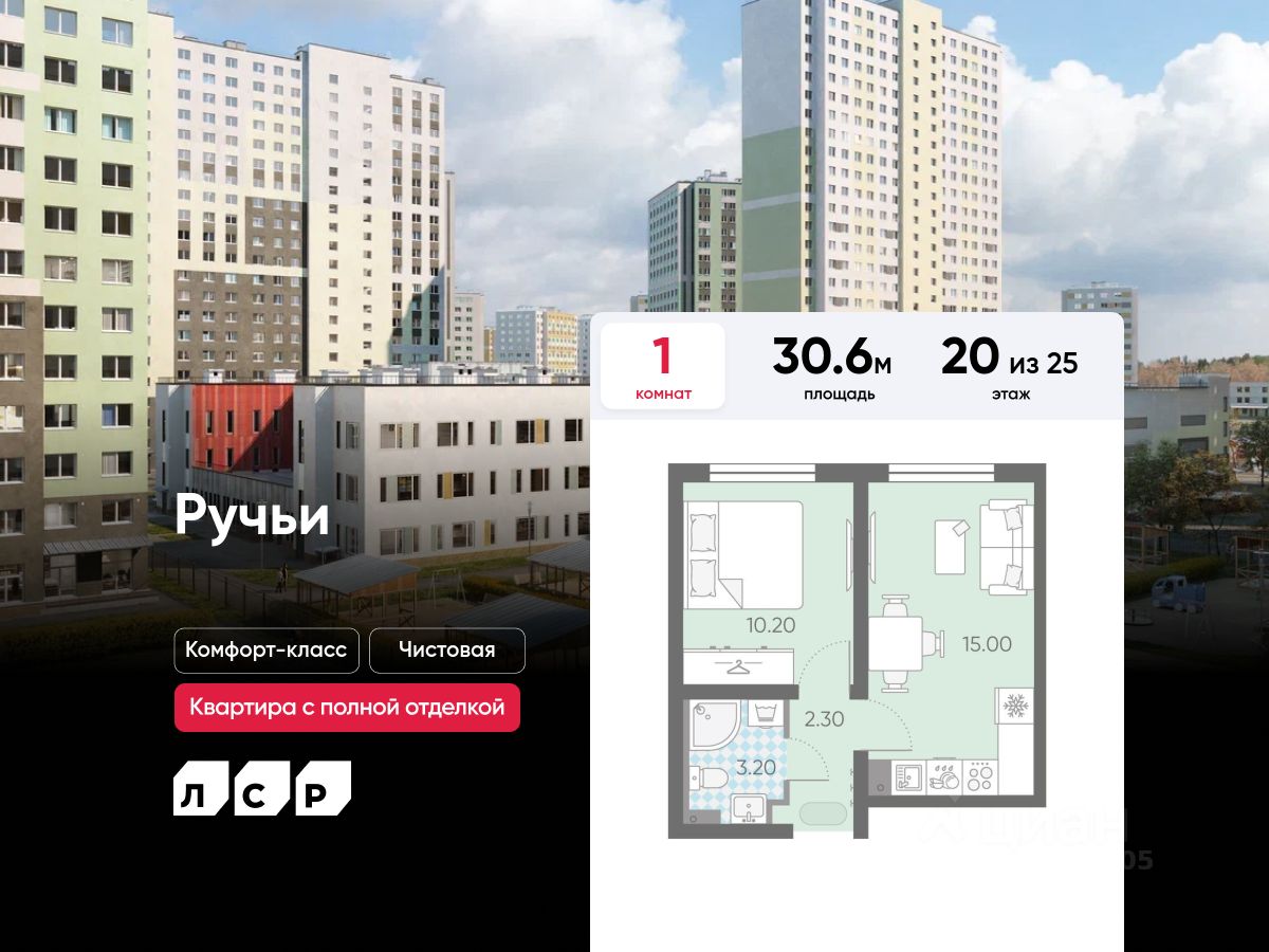 Продаётся 1-комнатная квартира в ЖК "Ручьи" на 20 этаже. Общая площадь составляет 30.60 кв. м. Квартира с чистовой отделкой. Жилой комплекс "Ручьи" располагается по адресу Санкт-Петербург, Красногвардейский.