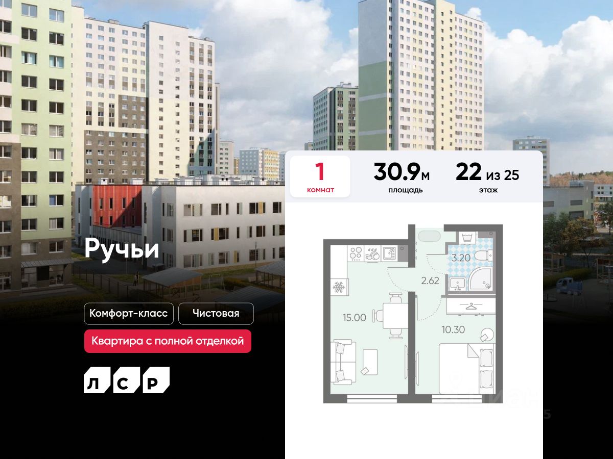 Продаётся 1-комнатная квартира в ЖК "Ручьи" на 22 этаже. Общая площадь составляет 30.90 кв. м. Квартира с чистовой отделкой. Жилой комплекс "Ручьи" располагается по адресу Санкт-Петербург, Красногвардейский.