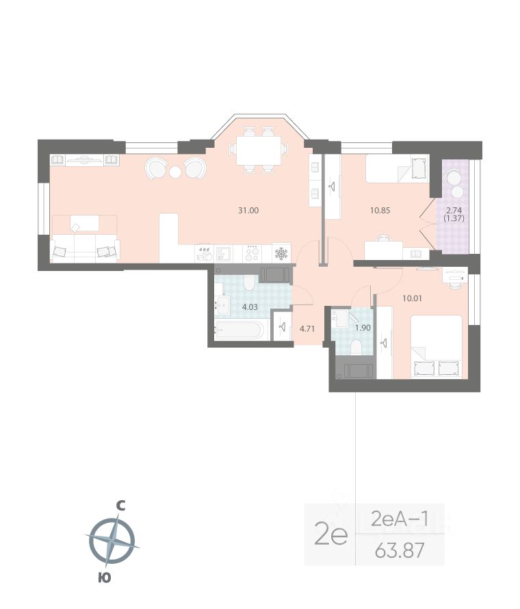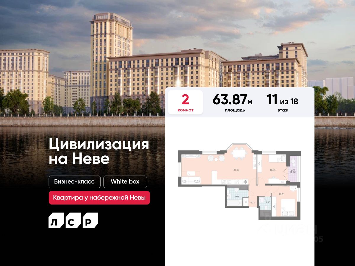 Продаётся 2-комнатная квартира в ЖК "Цивилизация на Неве" на 11 этаже. Общая площадь составляет 63.87 кв. м. Квартира с white box отделкой. Жилой комплекс "Цивилизация на Неве" располагается по адресу Санкт-Петербург, Невский.