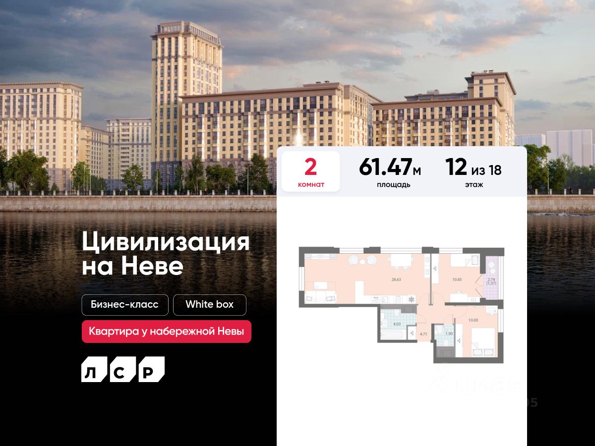 Продаётся 2-комнатная квартира в ЖК "Цивилизация на Неве" на 12 этаже. Общая площадь составляет 61.47 кв. м. Квартира с white box отделкой. Жилой комплекс "Цивилизация на Неве" располагается по адресу Санкт-Петербург, Невский.