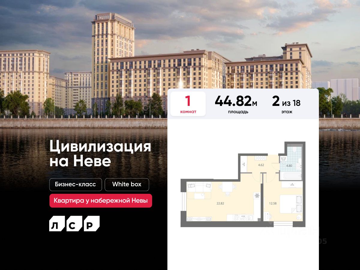 Продаётся 1-комнатная квартира в ЖК "Цивилизация на Неве" на 2 этаже. Общая площадь составляет 44.82 кв. м. Квартира с white box отделкой. Жилой комплекс "Цивилизация на Неве" располагается по адресу Санкт-Петербург, Невский.