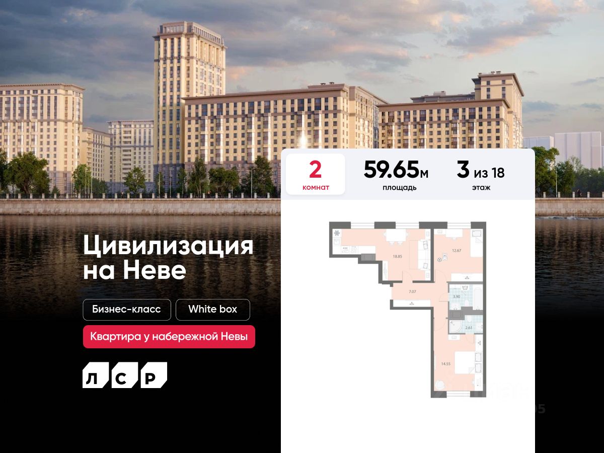 Продаётся 2-комнатная квартира в ЖК "Цивилизация на Неве" на 3 этаже. Общая площадь составляет 59.65 кв. м. Квартира с white box отделкой. Жилой комплекс "Цивилизация на Неве" располагается по адресу Санкт-Петербург, Невский.