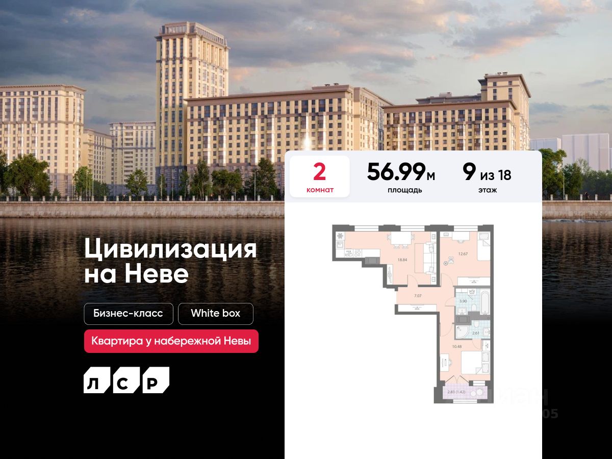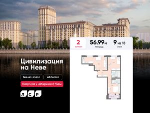 Продаётся 2-комнатная квартира в ЖК "Цивилизация на Неве" на 9 этаже. Общая площадь составляет 56.99 кв. м. Квартира с white box отделкой. Жилой комплекс "Цивилизация на Неве" располагается по адресу Санкт-Петербург, Невский.
