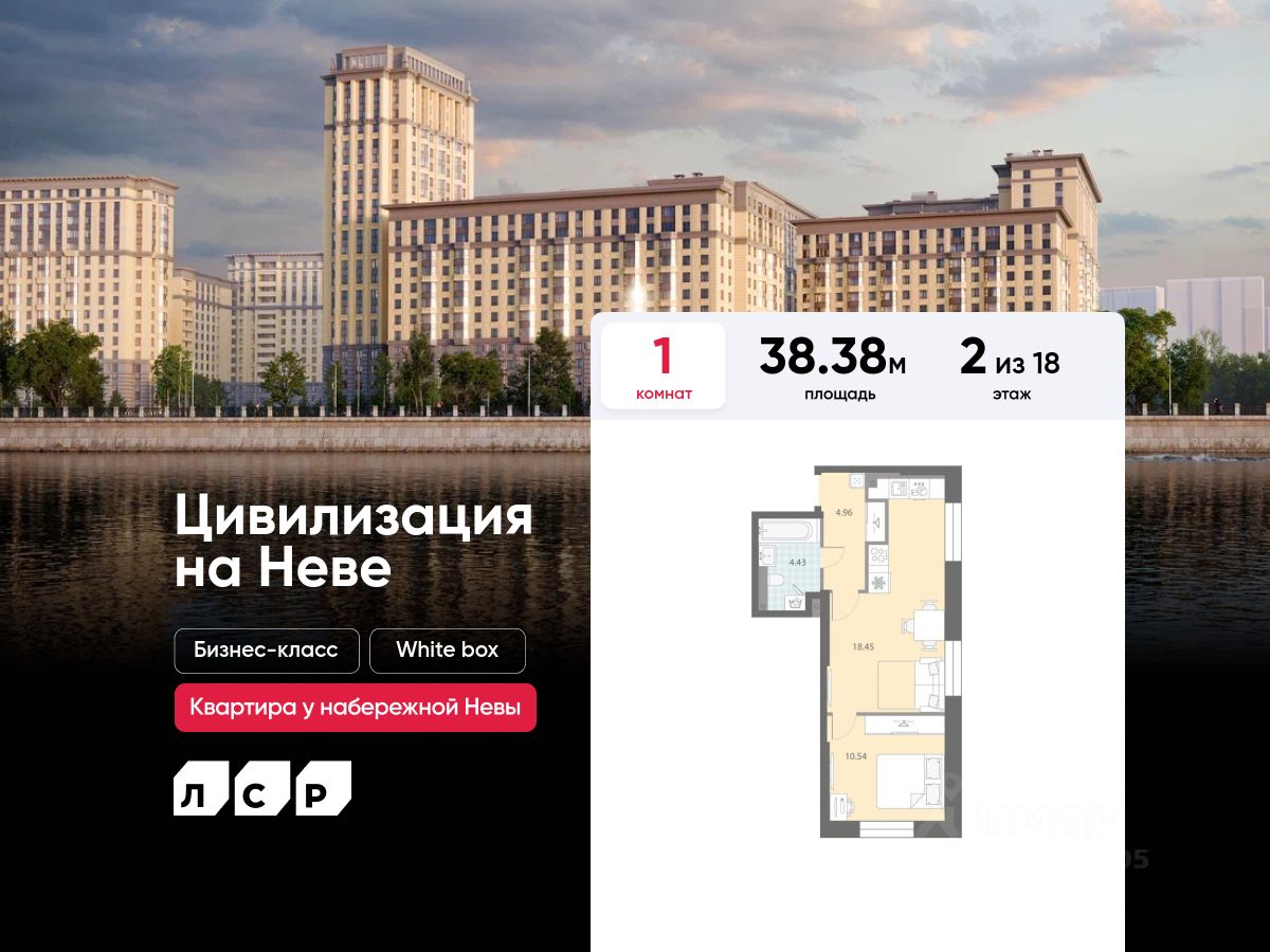Продаётся 1-комнатная квартира в ЖК "Цивилизация на Неве" на 2 этаже. Общая площадь составляет 38.38 кв. м. Квартира с white box отделкой. Жилой комплекс "Цивилизация на Неве" располагается по адресу Санкт-Петербург, Невский.