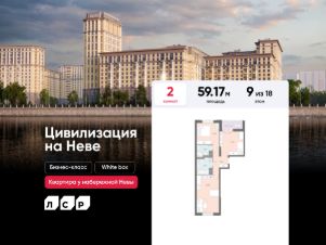Продаётся 2-комнатная квартира в ЖК "Цивилизация на Неве" на 9 этаже. Общая площадь составляет 59.17 кв. м. Квартира с white box отделкой. Жилой комплекс "Цивилизация на Неве" располагается по адресу Санкт-Петербург, Невский.