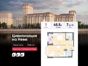 Продаётся 1-комнатная квартира в ЖК "Цивилизация на Неве" на 7 этаже. Общая площадь составляет 45.50 кв. м. Квартира с white box отделкой. Жилой комплекс "Цивилизация на Неве" располагается по адресу Санкт-Петербург, Невский.