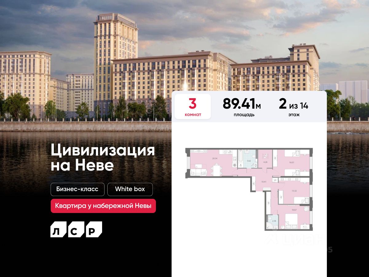 Продаётся 3-комнатная квартира в ЖК "Цивилизация на Неве" на 2 этаже. Общая площадь составляет 89.41 кв. м. Квартира с white box отделкой. Жилой комплекс "Цивилизация на Неве" располагается по адресу Санкт-Петербург, Невский.