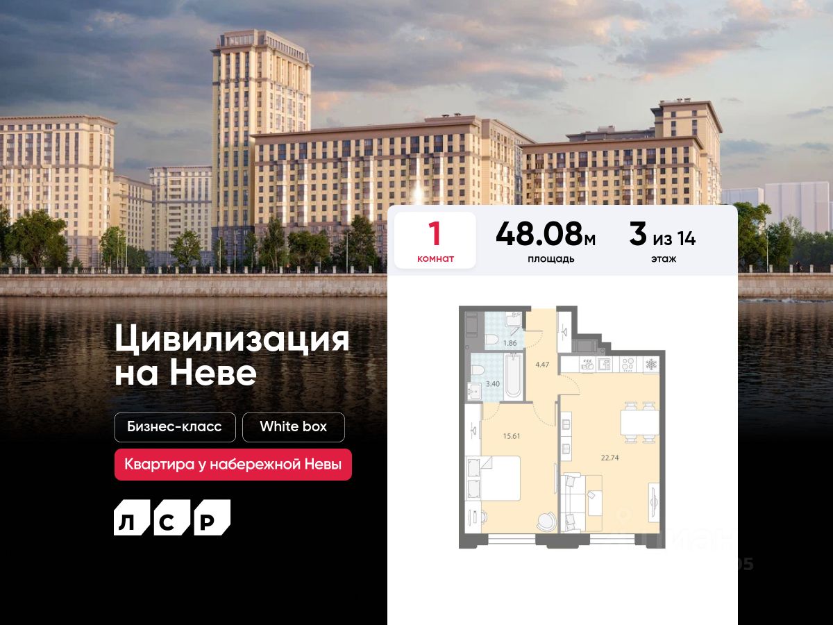 Продаётся 1-комнатная квартира в ЖК "Цивилизация на Неве" на 3 этаже. Общая площадь составляет 48.08 кв. м. Квартира с white box отделкой. Жилой комплекс "Цивилизация на Неве" располагается по адресу Санкт-Петербург, Невский.