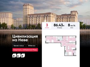 Продаётся 3-комнатная квартира в ЖК "Цивилизация на Неве" на 8 этаже. Общая площадь составляет 86.43 кв. м. Квартира с white box отделкой. Жилой комплекс "Цивилизация на Неве" располагается по адресу Санкт-Петербург, Невский.