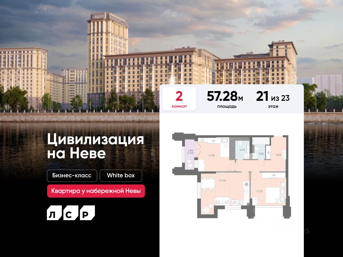 Продаётся 2-комнатная квартира в ЖК "Цивилизация на Неве" на 21 этаже. Общая площадь составляет 57.28 кв. м. Квартира с white box отделкой. Жилой комплекс "Цивилизация на Неве" располагается по адресу Санкт-Петербург, Невский.