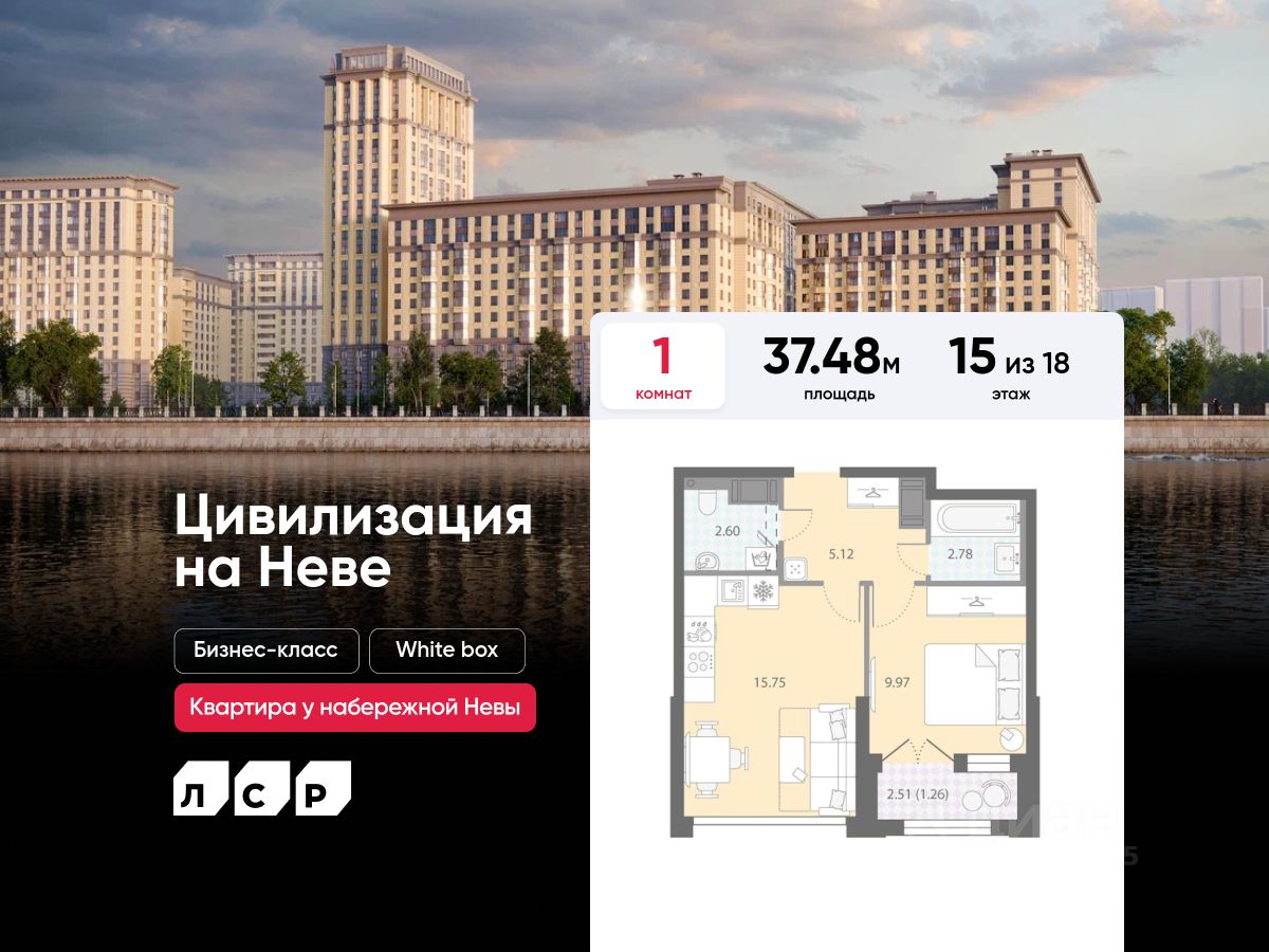 Продаётся 1-комнатная квартира в ЖК "Цивилизация на Неве" на 15 этаже. Общая площадь составляет 37.48 кв. м. Квартира с white box отделкой. Жилой комплекс "Цивилизация на Неве" располагается по адресу Санкт-Петербург, Невский.