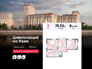 Продаётся 3-комнатная квартира в ЖК "Цивилизация на Неве" на 8 этаже. Общая площадь составляет 75.53 кв. м. Квартира с white box отделкой. Жилой комплекс "Цивилизация на Неве" располагается по адресу Санкт-Петербург, Невский.