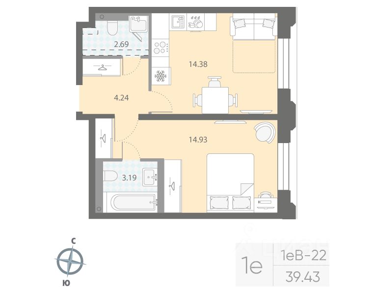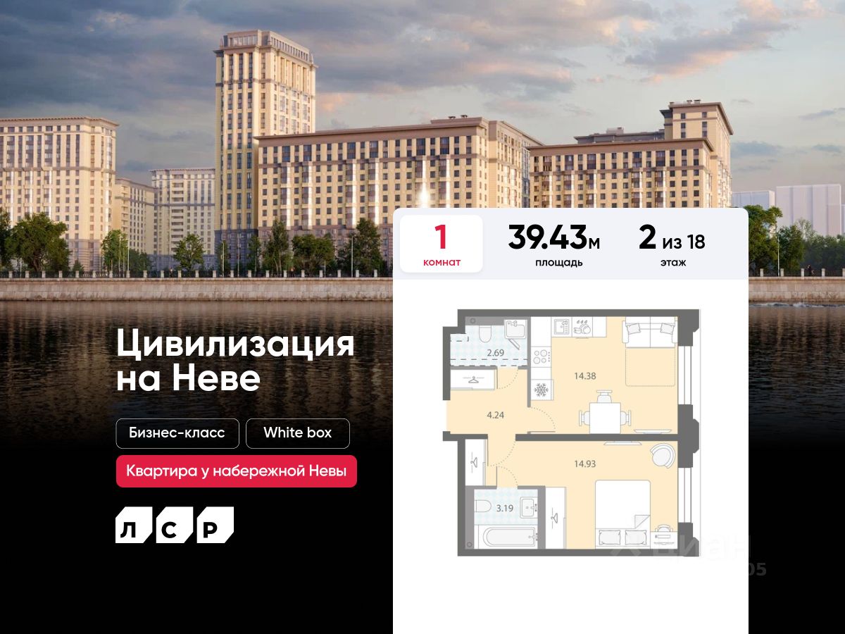 Продаётся 1-комнатная квартира в ЖК "Цивилизация на Неве" на 2 этаже. Общая площадь составляет 39.43 кв. м. Квартира с white box отделкой. Жилой комплекс "Цивилизация на Неве" располагается по адресу Санкт-Петербург, Невский.