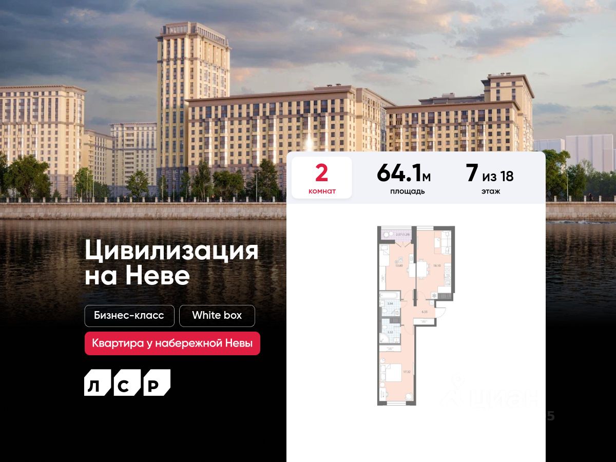 Продаётся 2-комнатная квартира в ЖК "Цивилизация на Неве" на 7 этаже. Общая площадь составляет 64.10 кв. м. Квартира с white box отделкой. Жилой комплекс "Цивилизация на Неве" располагается по адресу Санкт-Петербург, Невский.