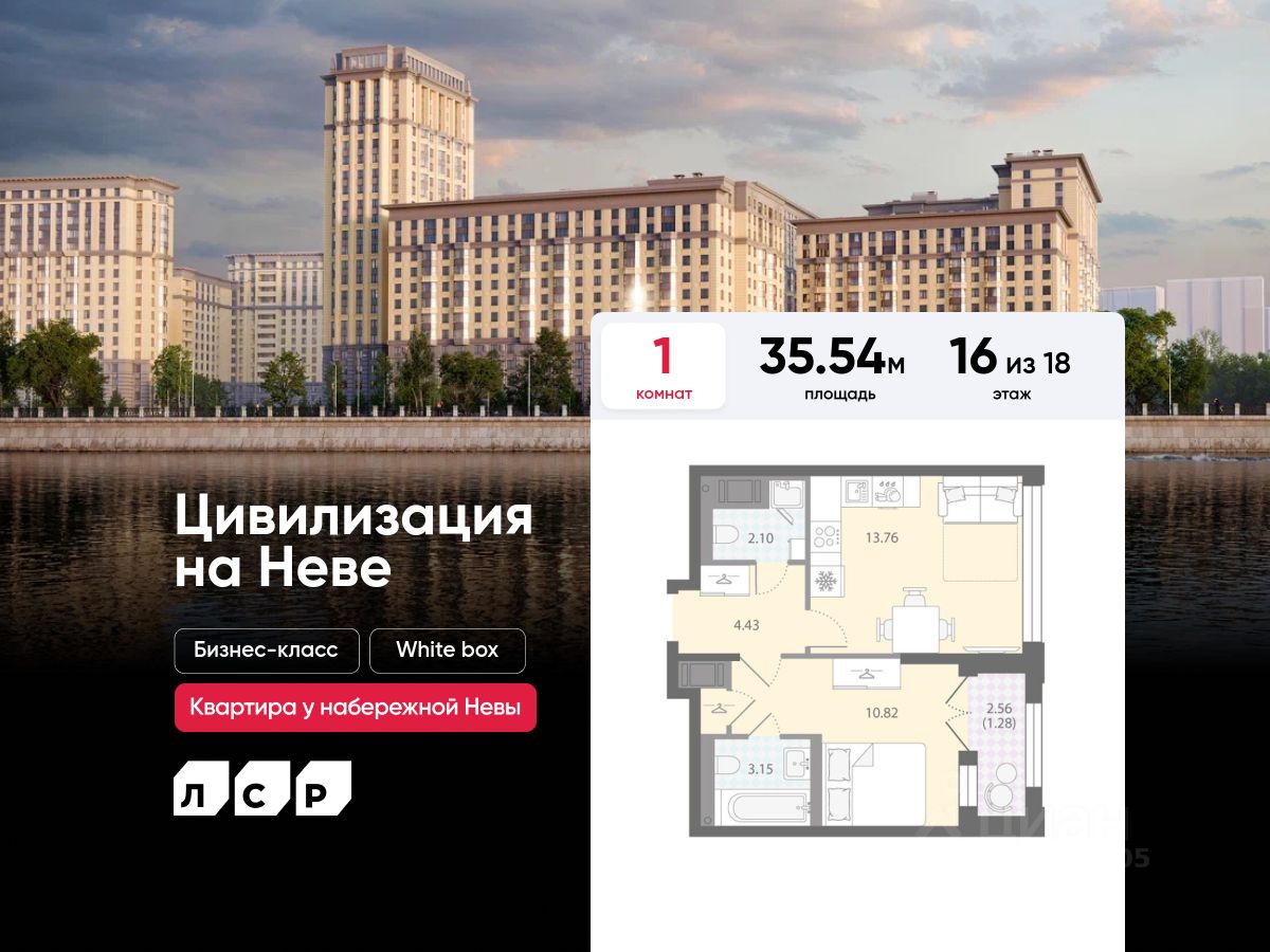 Продаётся 1-комнатная квартира в ЖК "Цивилизация на Неве" на 16 этаже. Общая площадь составляет 35.54 кв. м. Квартира с white box отделкой. Жилой комплекс "Цивилизация на Неве" располагается по адресу Санкт-Петербург, Невский.