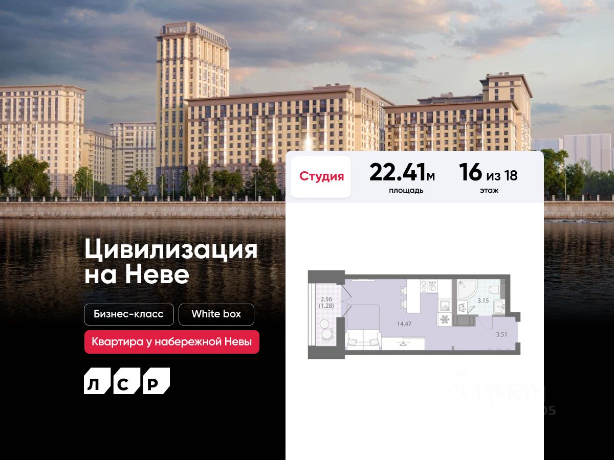 Продаётся студия в ЖК "Цивилизация на Неве" на 16 этаже. Общая площадь составляет 22.41 кв. м. Квартира с white box отделкой. Жилой комплекс "Цивилизация на Неве" располагается по адресу Санкт-Петербург, Невский.