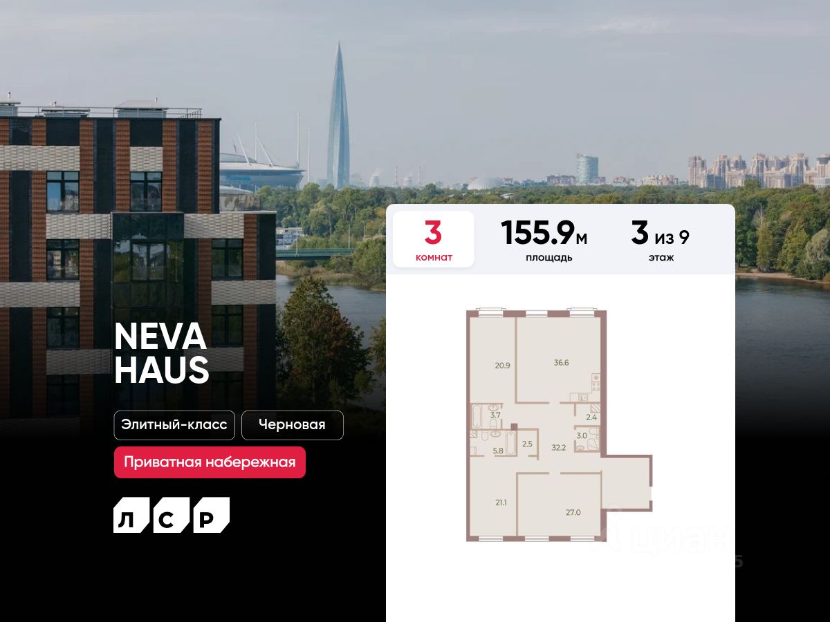 Продаётся 3-комнатная квартира в ЖК "NEVA HAUS" на 3 этаже. Общая площадь составляет 155.90 кв. м. Квартира без отделки. Жилой комплекс "NEVA HAUS" располагается по адресу Санкт-Петербург, Петроградский.