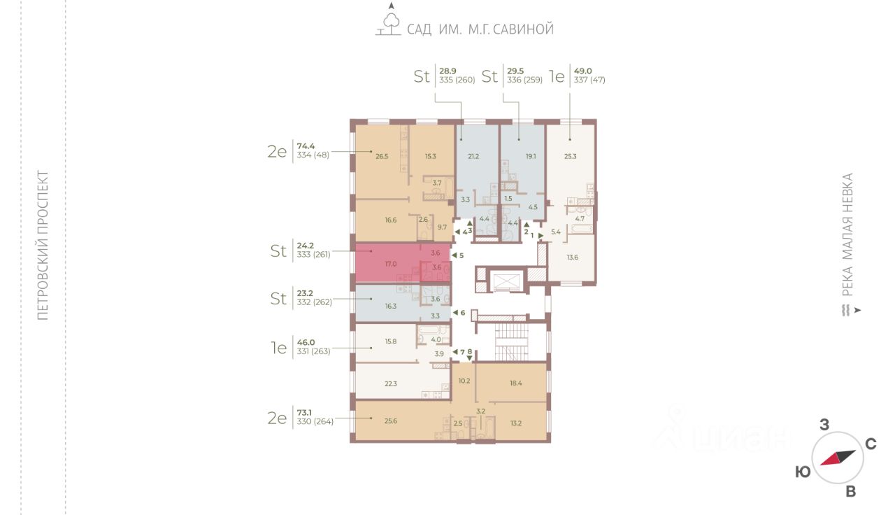 Цена действует при 100% оплате и на определенные ипотечные программы. Подробности — в отделе продаж по телефону. ЖК Нева Хаус - это масштабный проект элитного класса, который возведен застройщиком "ЛСР. Недвижимость - Северо-Запад" в одном из самых зеленых уголков Петроградского района. Он состоит из восьми монолитных разновысотных корпусов, в архитектурном облике которых гармонично сочетаются элементы постмодернизма, классического стиля и современных тенденций. Дизайн-проект ЖК был разработан известным петербуржским архитектором Евгением Герасимовым. Наружные стены домов оснащены износостойкими навесными фасадами и облицованы декоративным клинкерным кирпичом нескольких оттенков. Высота домов в проекте варьируется от 7 до 9 этажей. Комплекс оснащен современным оборудованием, которое обеспечивает жильцам максимальный уровень безопасности и комфорта. Покупателям предлагается разнообразный выбор планировок элитного жилья, начиная от просторных однокомнатных квартир и заканчивая пятикомнатными видовыми пентхаусами. Высота потолков в помещениях составляет 3-3.8 метра. Во всех форматах жилья предусмотрены большие кухни (от 12 кв. м), зонированные прихожие с отдельными гардеробными, увеличенные оконные проемы, ниши для установки кондиционеров и изолированные от бытовых помещений спальни. Разнообразие планировок включает варианты с просторными террасами, объединенными кухнями-гостиными, раздельными санузлами и дополнительными туалетами, эркерами и помещениями нестандартной формы. Площадь квартир - 46.87-300.79 квадратных метров. Базовая стоимость жилья не включает предчистовую или чистовую отделку помещений. В готовых квартирах установлены усиленные дизайнерские двери, оконные блоки с дерево-алюминиевыми рамами из натурального дуба и двойными стеклопакетами, современные отопительные радиаторы, оснащенные регуляторами температуры, и счетчики с функцией автоматического сбора и передачи данных. Закрытые дворы комплекса превращены в уютные прогулочные зоны для детей и взрослых. Застройщик выполнил озеленение пространства, согласно авторскому проекту ландшафтного дизайна, проложил велодорожки и тротуары, организовал закрытую набережную, установил многофункциональные спортивно-игровые городки, беседки, лавочки и стойки для велосипедов. Вся территория ЖК круглосуточно находится под охраной и видеонаблюдением. Для автотранспорта жильцов новостройки предусмотрены подземные паркинги с возможностью доступа из всех парадных на лифте. Их общая вместимость составляет 907 машиномест. Для посетителей организованы наземные стоянки по внешнему периметру территории. Жилой комплекс Нева Хаус находится в элитном районе города в окружении разнообразных объектов инфраструктуры. В пешей доступности работают гимназии, бутики, рестораны, спортивный стадион "Петровский" и филиалы ВУЗов, есть парк и яхт-клуб. Купить квартиру в жилом комплексе Нева Хаус можно в рассрочку или с привлечением ипотечного кредита, в том числе, и на льготных условиях с использованием воен