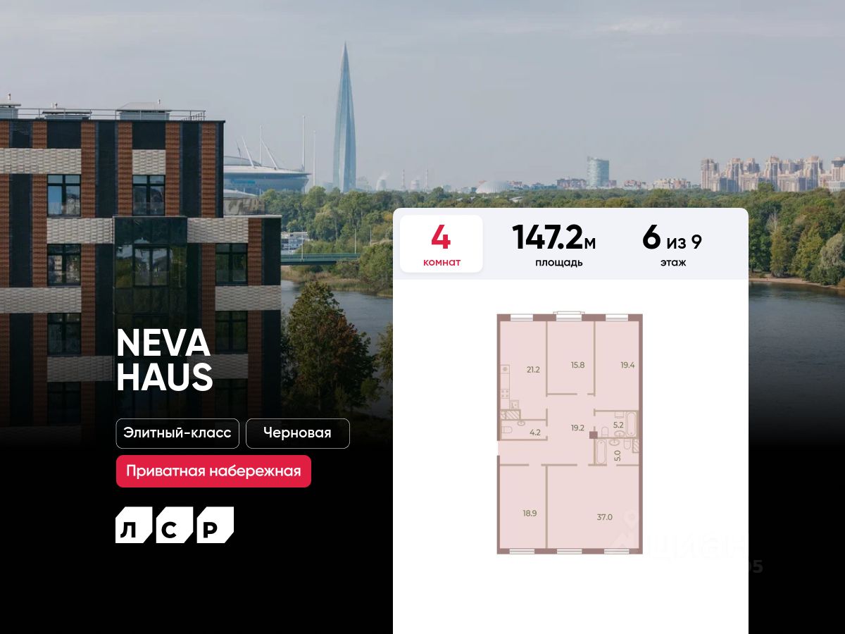 Продаётся 4-комнатная квартира в ЖК "NEVA HAUS" на 6 этаже. Общая площадь составляет 147.20 кв. м. Квартира без отделки. Жилой комплекс "NEVA HAUS" располагается по адресу Санкт-Петербург, Петроградский.
