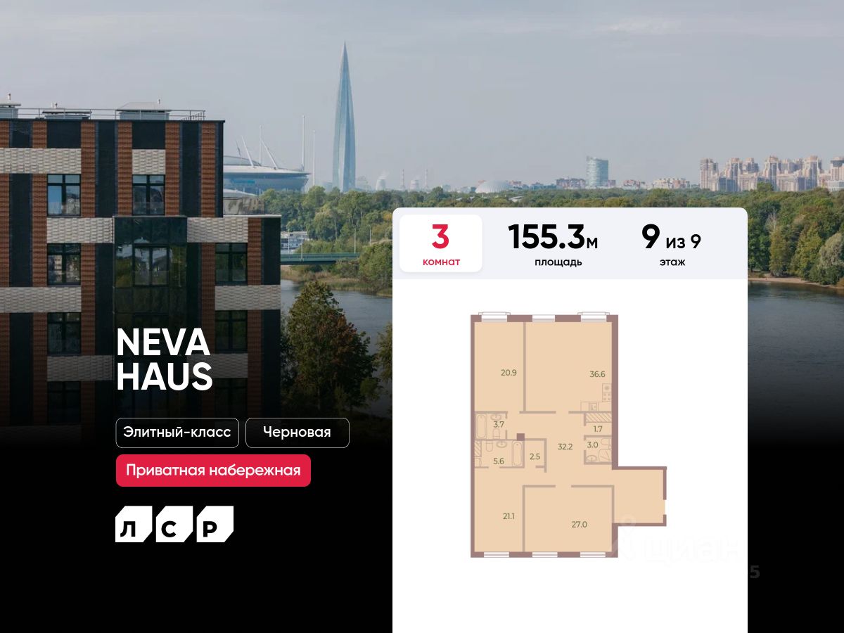Продаётся 3-комнатная квартира в ЖК "NEVA HAUS" на 9 этаже. Общая площадь составляет 155.30 кв. м. Квартира без отделки. Жилой комплекс "NEVA HAUS" располагается по адресу Санкт-Петербург, Петроградский.