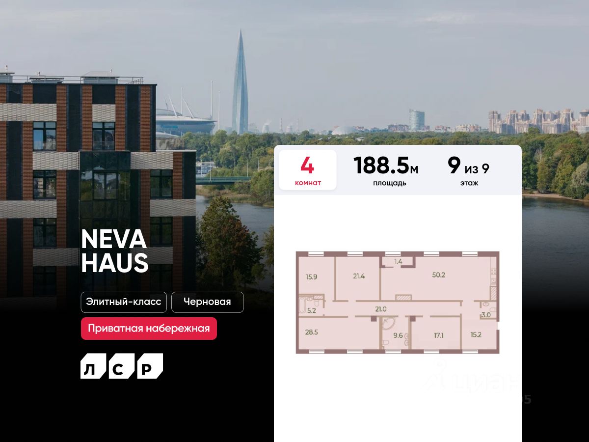 Продаётся 4-комнатная квартира в ЖК "NEVA HAUS" на 9 этаже. Общая площадь составляет 188.50 кв. м. Квартира без отделки. Жилой комплекс "NEVA HAUS" располагается по адресу Санкт-Петербург, Петроградский.