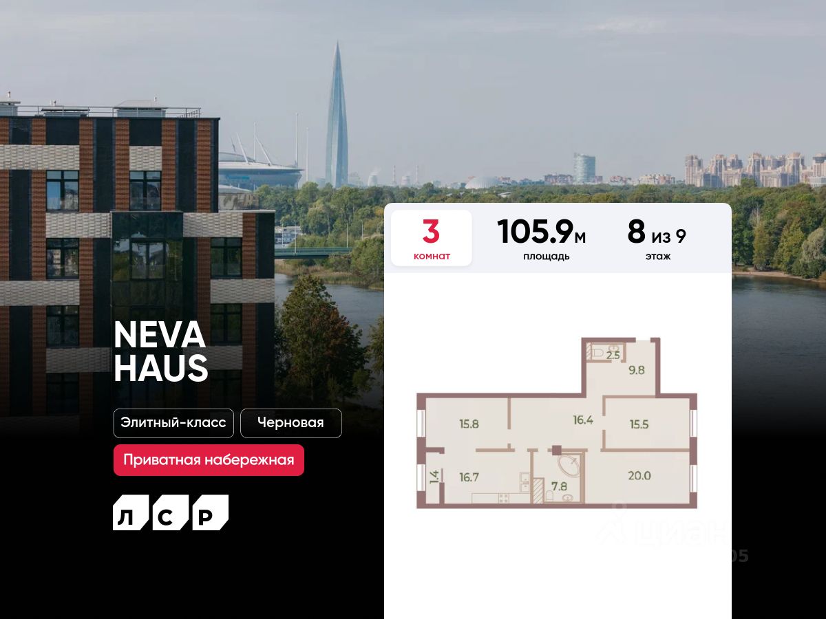 Продаётся 3-комнатная квартира в ЖК "NEVA HAUS" на 8 этаже. Общая площадь составляет 105.90 кв. м. Квартира без отделки. Жилой комплекс "NEVA HAUS" располагается по адресу Санкт-Петербург, Петроградский.