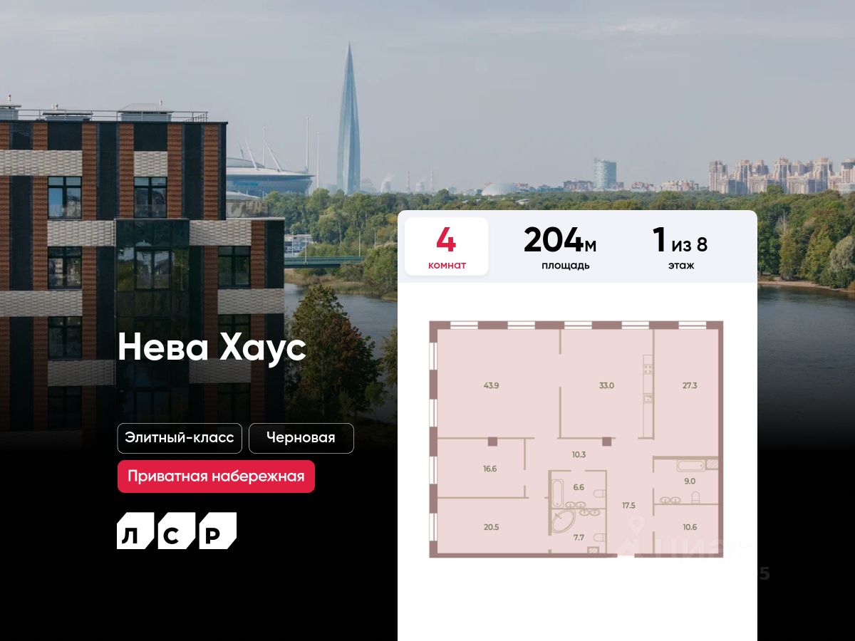Цена действует при 100% оплате и на определенные ипотечные программы. Подробности — в отделе продаж по телефону. ЖК Нева Хаус - это масштабный проект элитного класса, который возведен застройщиком "ЛСР. Недвижимость - Северо-Запад" в одном из самых зеленых уголков Петроградского района. Он состоит из восьми монолитных разновысотных корпусов, в архитектурном облике которых гармонично сочетаются элементы постмодернизма, классического стиля и современных тенденций. Дизайн-проект ЖК был разработан известным петербуржским архитектором Евгением Герасимовым. Наружные стены домов оснащены износостойкими навесными фасадами и облицованы декоративным клинкерным кирпичом нескольких оттенков. Высота домов в проекте варьируется от 7 до 9 этажей. Комплекс оснащен современным оборудованием, которое обеспечивает жильцам максимальный уровень безопасности и комфорта. Покупателям предлагается разнообразный выбор планировок элитного жилья, начиная от просторных однокомнатных квартир и заканчивая пятикомнатными видовыми пентхаусами. Высота потолков в помещениях составляет 3-3.8 метра. Во всех форматах жилья предусмотрены большие кухни (от 12 кв. м), зонированные прихожие с отдельными гардеробными, увеличенные оконные проемы, ниши для установки кондиционеров и изолированные от бытовых помещений спальни. Разнообразие планировок включает варианты с просторными террасами, объединенными кухнями-гостиными, раздельными санузлами и дополнительными туалетами, эркерами и помещениями нестандартной формы. Площадь квартир - 46.87-300.79 квадратных метров. Базовая стоимость жилья не включает предчистовую или чистовую отделку помещений. В готовых квартирах установлены усиленные дизайнерские двери, оконные блоки с дерево-алюминиевыми рамами из натурального дуба и двойными стеклопакетами, современные отопительные радиаторы, оснащенные регуляторами температуры, и счетчики с функцией автоматического сбора и передачи данных. Закрытые дворы комплекса превращены в уютные прогулочные зоны для детей и взрослых. Застройщик выполнил озеленение пространства, согласно авторскому проекту ландшафтного дизайна, проложил велодорожки и тротуары, организовал закрытую набережную, установил многофункциональные спортивно-игровые городки, беседки, лавочки и стойки для велосипедов. Вся территория ЖК круглосуточно находится под охраной и видеонаблюдением. Для автотранспорта жильцов новостройки предусмотрены подземные паркинги с возможностью доступа из всех парадных на лифте. Их общая вместимость составляет 907 машиномест. Для посетителей организованы наземные стоянки по внешнему периметру территории. Жилой комплекс Нева Хаус находится в элитном районе города в окружении разнообразных объектов инфраструктуры. В пешей доступности работают гимназии, бутики, рестораны, спортивный стадион "Петровский" и филиалы ВУЗов, есть парк и яхт-клуб. Купить квартиру в жилом комплексе Нева Хаус можно в рассрочку или с привлечением ипотечного кредита, в том числе, и на льготных условиях с использованием воен