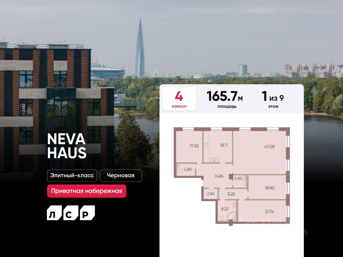 Продаётся 4-комнатная квартира в ЖК "NEVA HAUS" на 1 этаже. Общая площадь составляет 165.70 кв. м. Квартира без отделки. Жилой комплекс "NEVA HAUS" располагается по адресу Санкт-Петербург, Петроградский.