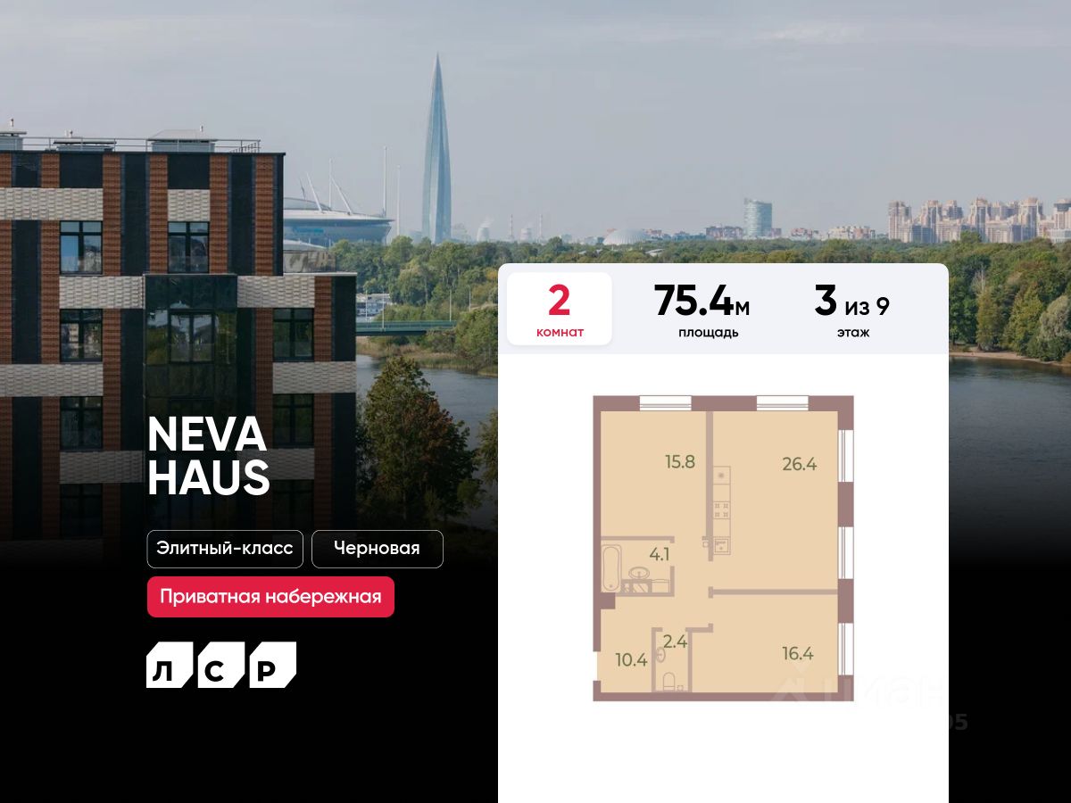 Продаётся 2-комнатная квартира в ЖК "NEVA HAUS" на 3 этаже. Общая площадь составляет 75.40 кв. м. Квартира без отделки. Жилой комплекс "NEVA HAUS" располагается по адресу Санкт-Петербург, Петроградский.