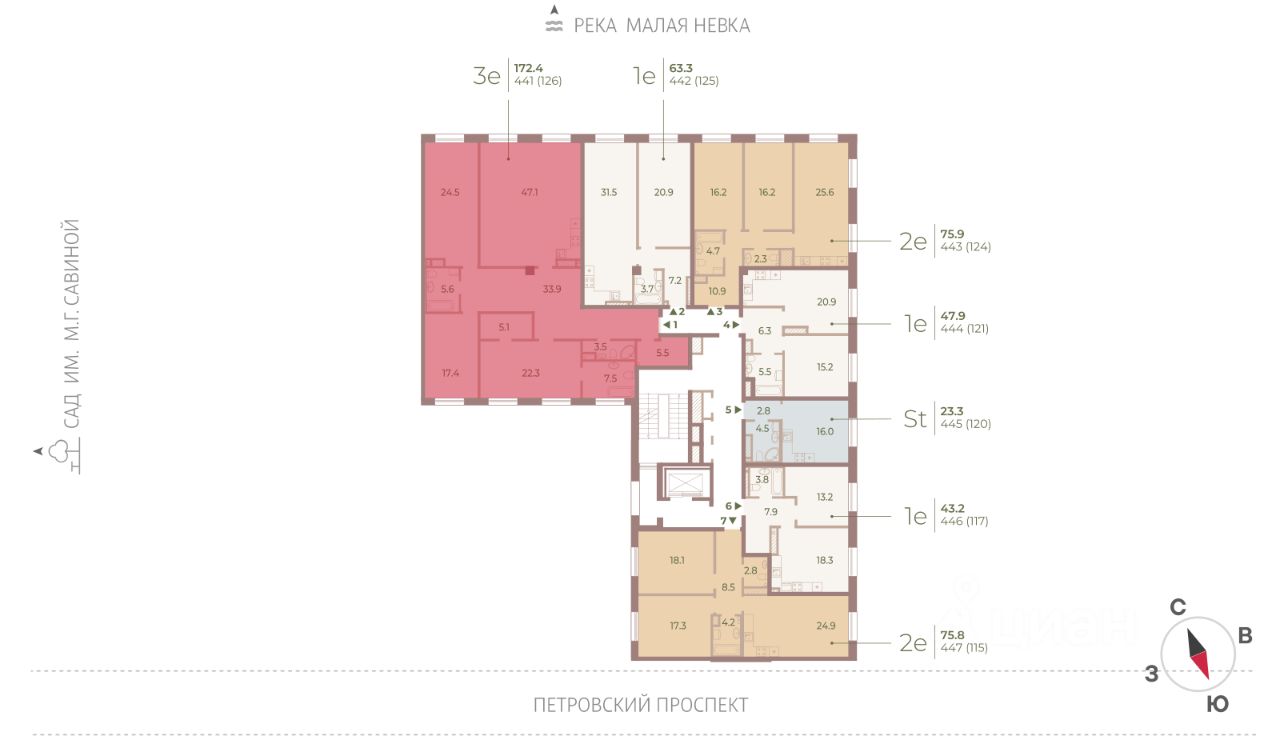 Цена действует при 100% оплате и на определенные ипотечные программы. Подробности — в отделе продаж по телефону. ЖК Нева Хаус - это масштабный проект элитного класса, который возведен застройщиком "ЛСР. Недвижимость - Северо-Запад" в одном из самых зеленых уголков Петроградского района. Он состоит из восьми монолитных разновысотных корпусов, в архитектурном облике которых гармонично сочетаются элементы постмодернизма, классического стиля и современных тенденций. Дизайн-проект ЖК был разработан известным петербуржским архитектором Евгением Герасимовым. Наружные стены домов оснащены износостойкими навесными фасадами и облицованы декоративным клинкерным кирпичом нескольких оттенков. Высота домов в проекте варьируется от 7 до 9 этажей. Комплекс оснащен современным оборудованием, которое обеспечивает жильцам максимальный уровень безопасности и комфорта. Покупателям предлагается разнообразный выбор планировок элитного жилья, начиная от просторных однокомнатных квартир и заканчивая пятикомнатными видовыми пентхаусами. Высота потолков в помещениях составляет 3-3.8 метра. Во всех форматах жилья предусмотрены большие кухни (от 12 кв. м), зонированные прихожие с отдельными гардеробными, увеличенные оконные проемы, ниши для установки кондиционеров и изолированные от бытовых помещений спальни. Разнообразие планировок включает варианты с просторными террасами, объединенными кухнями-гостиными, раздельными санузлами и дополнительными туалетами, эркерами и помещениями нестандартной формы. Площадь квартир - 46.87-300.79 квадратных метров. Базовая стоимость жилья не включает предчистовую или чистовую отделку помещений. В готовых квартирах установлены усиленные дизайнерские двери, оконные блоки с дерево-алюминиевыми рамами из натурального дуба и двойными стеклопакетами, современные отопительные радиаторы, оснащенные регуляторами температуры, и счетчики с функцией автоматического сбора и передачи данных. Закрытые дворы комплекса превращены в уютные прогулочные зоны для детей и взрослых. Застройщик выполнил озеленение пространства, согласно авторскому проекту ландшафтного дизайна, проложил велодорожки и тротуары, организовал закрытую набережную, установил многофункциональные спортивно-игровые городки, беседки, лавочки и стойки для велосипедов. Вся территория ЖК круглосуточно находится под охраной и видеонаблюдением. Для автотранспорта жильцов новостройки предусмотрены подземные паркинги с возможностью доступа из всех парадных на лифте. Их общая вместимость составляет 907 машиномест. Для посетителей организованы наземные стоянки по внешнему периметру территории. Жилой комплекс Нева Хаус находится в элитном районе города в окружении разнообразных объектов инфраструктуры. В пешей доступности работают гимназии, бутики, рестораны, спортивный стадион "Петровский" и филиалы ВУЗов, есть парк и яхт-клуб. Купить квартиру в жилом комплексе Нева Хаус можно в рассрочку или с привлечением ипотечного кредита, в том числе, и на льготных условиях с использованием воен