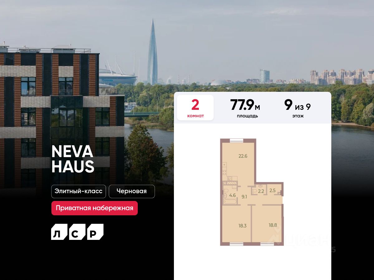 Продаётся 2-комнатная квартира в ЖК "NEVA HAUS" на 9 этаже. Общая площадь составляет 77.90 кв. м. Квартира без отделки. Жилой комплекс "NEVA HAUS" располагается по адресу Санкт-Петербург, Петроградский.