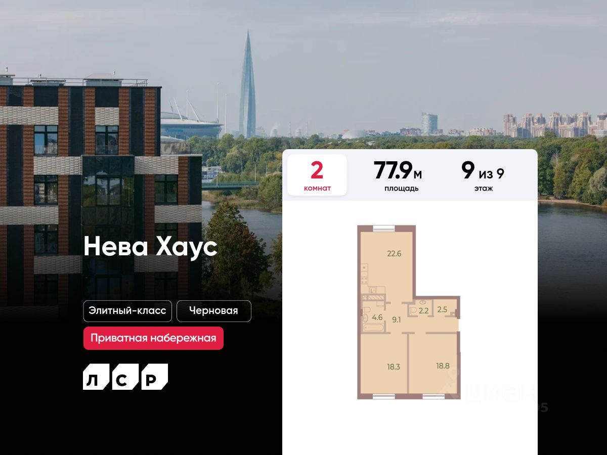 Цена действует при 100% оплате и на определенные ипотечные программы. Подробности — в отделе продаж по телефону. ЖК Нева Хаус - это масштабный проект элитного класса, который возведен застройщиком "ЛСР. Недвижимость - Северо-Запад" в одном из самых зеленых уголков Петроградского района. Он состоит из восьми монолитных разновысотных корпусов, в архитектурном облике которых гармонично сочетаются элементы постмодернизма, классического стиля и современных тенденций. Дизайн-проект ЖК был разработан известным петербуржским архитектором Евгением Герасимовым. Наружные стены домов оснащены износостойкими навесными фасадами и облицованы декоративным клинкерным кирпичом нескольких оттенков. Высота домов в проекте варьируется от 7 до 9 этажей. Комплекс оснащен современным оборудованием, которое обеспечивает жильцам максимальный уровень безопасности и комфорта. Покупателям предлагается разнообразный выбор планировок элитного жилья, начиная от просторных однокомнатных квартир и заканчивая пятикомнатными видовыми пентхаусами. Высота потолков в помещениях составляет 3-3.8 метра. Во всех форматах жилья предусмотрены большие кухни (от 12 кв. м), зонированные прихожие с отдельными гардеробными, увеличенные оконные проемы, ниши для установки кондиционеров и изолированные от бытовых помещений спальни. Разнообразие планировок включает варианты с просторными террасами, объединенными кухнями-гостиными, раздельными санузлами и дополнительными туалетами, эркерами и помещениями нестандартной формы. Площадь квартир - 46.87-300.79 квадратных метров. Базовая стоимость жилья не включает предчистовую или чистовую отделку помещений. В готовых квартирах установлены усиленные дизайнерские двери, оконные блоки с дерево-алюминиевыми рамами из натурального дуба и двойными стеклопакетами, современные отопительные радиаторы, оснащенные регуляторами температуры, и счетчики с функцией автоматического сбора и передачи данных. Закрытые дворы комплекса превращены в уютные прогулочные зоны для детей и взрослых. Застройщик выполнил озеленение пространства, согласно авторскому проекту ландшафтного дизайна, проложил велодорожки и тротуары, организовал закрытую набережную, установил многофункциональные спортивно-игровые городки, беседки, лавочки и стойки для велосипедов. Вся территория ЖК круглосуточно находится под охраной и видеонаблюдением. Для автотранспорта жильцов новостройки предусмотрены подземные паркинги с возможностью доступа из всех парадных на лифте. Их общая вместимость составляет 907 машиномест. Для посетителей организованы наземные стоянки по внешнему периметру территории. Жилой комплекс Нева Хаус находится в элитном районе города в окружении разнообразных объектов инфраструктуры. В пешей доступности работают гимназии, бутики, рестораны, спортивный стадион "Петровский" и филиалы ВУЗов, есть парк и яхт-клуб. Купить квартиру в жилом комплексе Нева Хаус можно в рассрочку или с привлечением ипотечного кредита, в том числе, и на льготных условиях с использованием воен