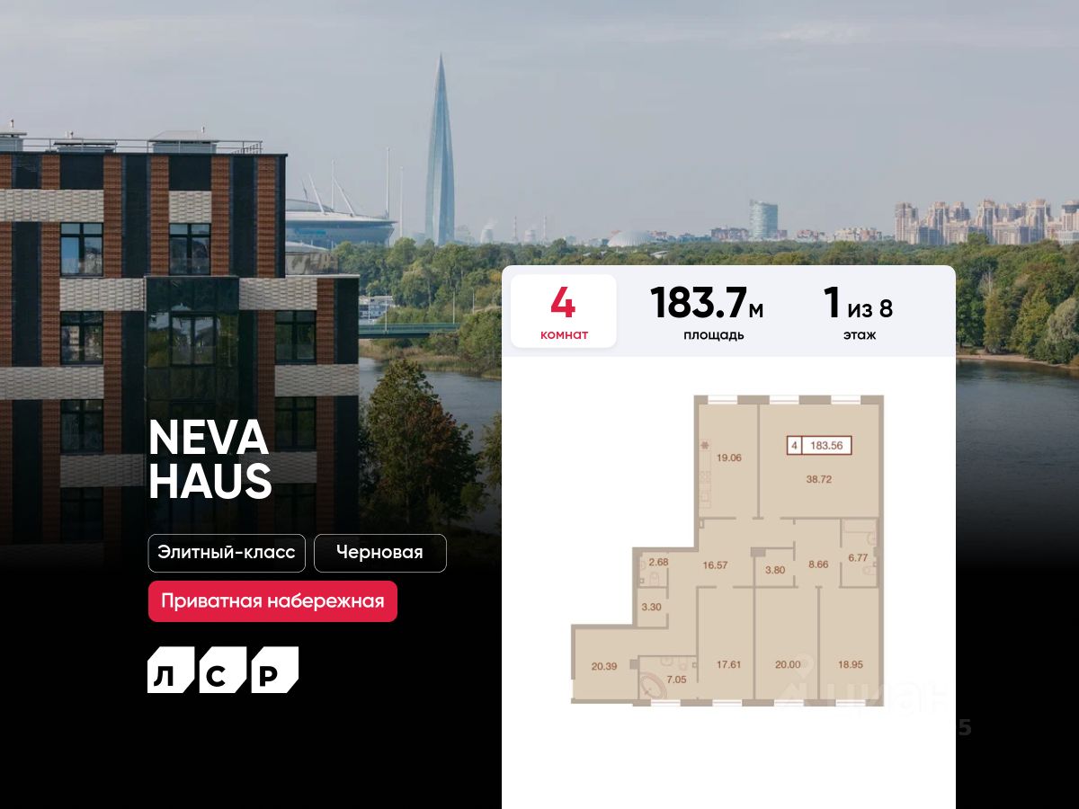 Продаётся 4-комнатная квартира в ЖК "NEVA HAUS" на 1 этаже. Общая площадь составляет 183.70 кв. м. Квартира без отделки. Жилой комплекс "NEVA HAUS" располагается по адресу Санкт-Петербург, Петроградский.