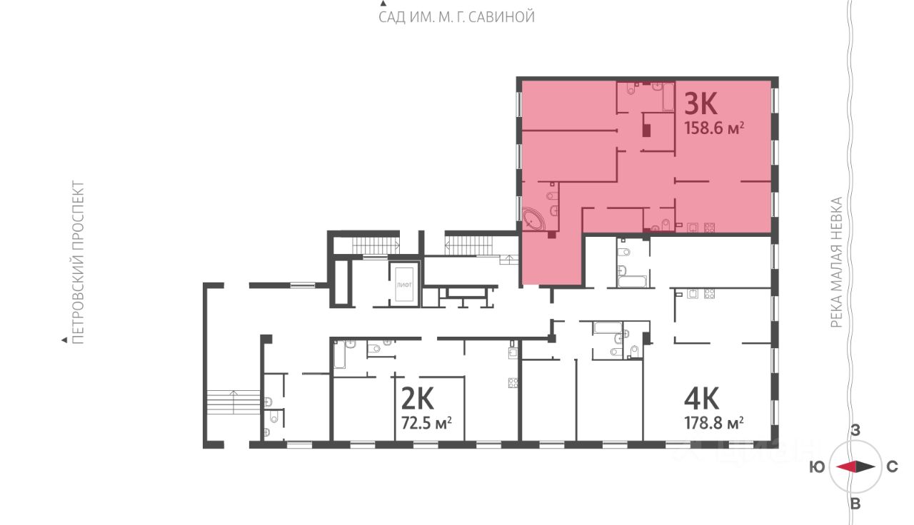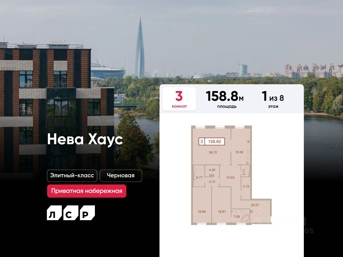 Цена действует при 100% оплате и на определенные ипотечные программы. Подробности — в отделе продаж по телефону. ЖК Нева Хаус - это масштабный проект элитного класса, который возведен застройщиком "ЛСР. Недвижимость - Северо-Запад" в одном из самых зеленых уголков Петроградского района. Он состоит из восьми монолитных разновысотных корпусов, в архитектурном облике которых гармонично сочетаются элементы постмодернизма, классического стиля и современных тенденций. Дизайн-проект ЖК был разработан известным петербуржским архитектором Евгением Герасимовым. Наружные стены домов оснащены износостойкими навесными фасадами и облицованы декоративным клинкерным кирпичом нескольких оттенков. Высота домов в проекте варьируется от 7 до 9 этажей. Комплекс оснащен современным оборудованием, которое обеспечивает жильцам максимальный уровень безопасности и комфорта. Покупателям предлагается разнообразный выбор планировок элитного жилья, начиная от просторных однокомнатных квартир и заканчивая пятикомнатными видовыми пентхаусами. Высота потолков в помещениях составляет 3-3.8 метра. Во всех форматах жилья предусмотрены большие кухни (от 12 кв. м), зонированные прихожие с отдельными гардеробными, увеличенные оконные проемы, ниши для установки кондиционеров и изолированные от бытовых помещений спальни. Разнообразие планировок включает варианты с просторными террасами, объединенными кухнями-гостиными, раздельными санузлами и дополнительными туалетами, эркерами и помещениями нестандартной формы. Площадь квартир - 46.87-300.79 квадратных метров. Базовая стоимость жилья не включает предчистовую или чистовую отделку помещений. В готовых квартирах установлены усиленные дизайнерские двери, оконные блоки с дерево-алюминиевыми рамами из натурального дуба и двойными стеклопакетами, современные отопительные радиаторы, оснащенные регуляторами температуры, и счетчики с функцией автоматического сбора и передачи данных. Закрытые дворы комплекса превращены в уютные прогулочные зоны для детей и взрослых. Застройщик выполнил озеленение пространства, согласно авторскому проекту ландшафтного дизайна, проложил велодорожки и тротуары, организовал закрытую набережную, установил многофункциональные спортивно-игровые городки, беседки, лавочки и стойки для велосипедов. Вся территория ЖК круглосуточно находится под охраной и видеонаблюдением. Для автотранспорта жильцов новостройки предусмотрены подземные паркинги с возможностью доступа из всех парадных на лифте. Их общая вместимость составляет 907 машиномест. Для посетителей организованы наземные стоянки по внешнему периметру территории. Жилой комплекс Нева Хаус находится в элитном районе города в окружении разнообразных объектов инфраструктуры. В пешей доступности работают гимназии, бутики, рестораны, спортивный стадион "Петровский" и филиалы ВУЗов, есть парк и яхт-клуб. Купить квартиру в жилом комплексе Нева Хаус можно в рассрочку или с привлечением ипотечного кредита, в том числе, и на льготных условиях с использованием воен
