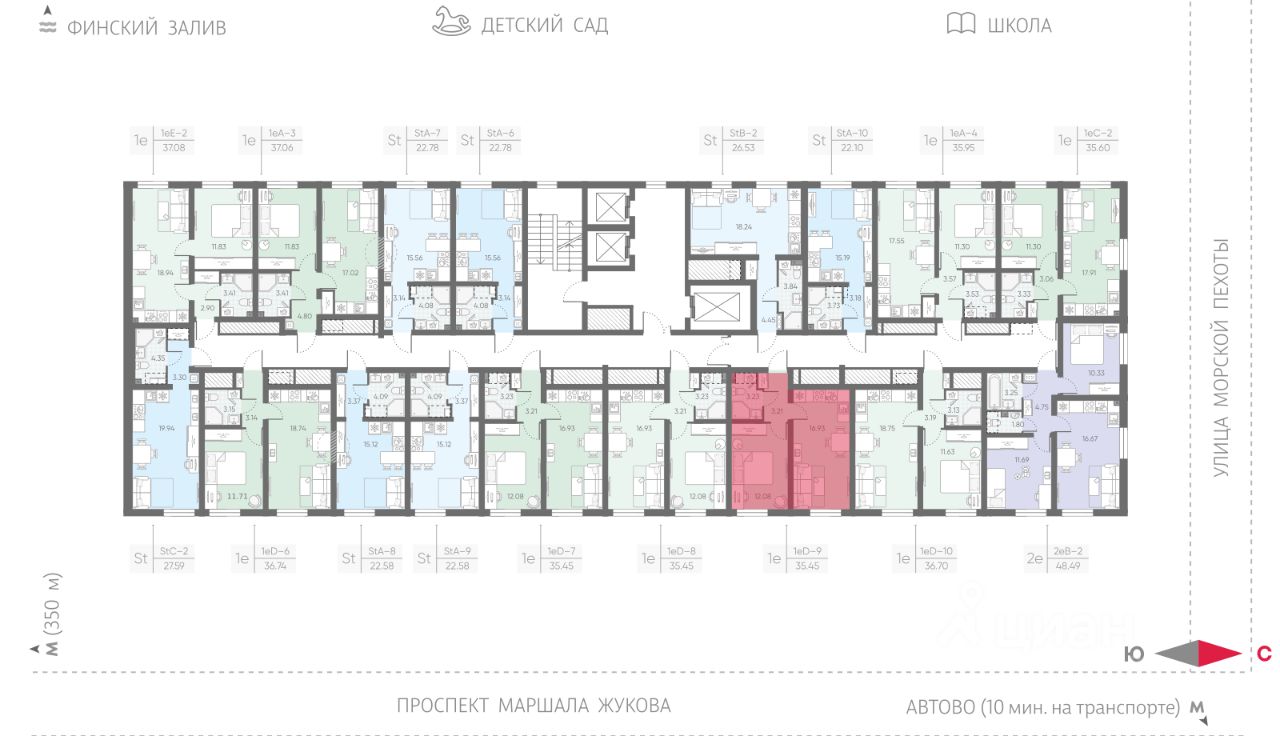 Продается 1-комнатная квартира в ЖК "Морская миля" на 2 этаже. Общая площадь составляет 35.45 кв. м. Квартира с чистовой отделкой. Жилой комплекс "Морская миля" располагается по адресу Санкт-Петербург, Красносельский.