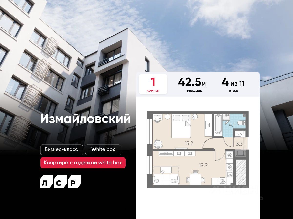 Продаётся 1-комнатная квартира в ЖК "Измайловский" на 4 этаже. Общая площадь составляет 42.50 кв. м. Квартира с white box отделкой. Жилой комплекс "Измайловский" располагается по адресу Санкт-Петербург, Адмиралтейский.