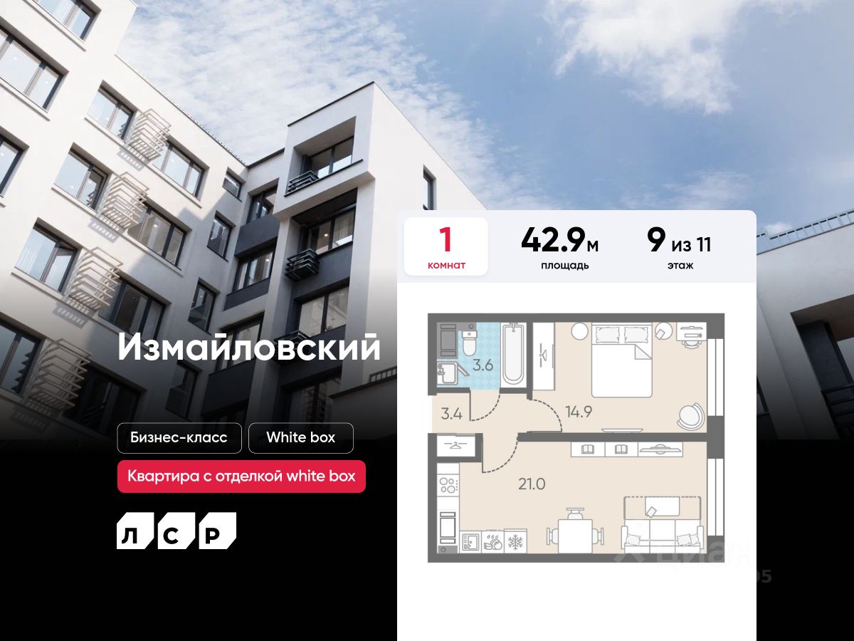 Продаётся 1-комнатная квартира в ЖК "Измайловский" на 9 этаже. Общая площадь составляет 42.90 кв. м. Квартира с white box отделкой. Жилой комплекс "Измайловский" располагается по адресу Санкт-Петербург, Адмиралтейский.