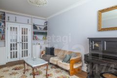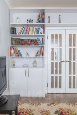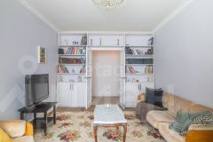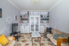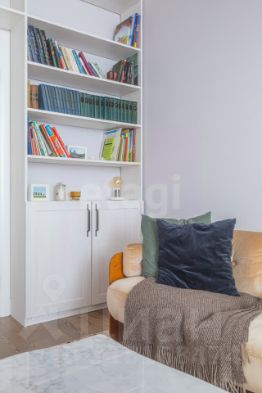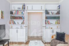 Полы в комнатах сделаны из дорогой паркетной доски. Высокие белые плинтусы во всей квартире изготовлены из цельного дерева, как и книжный шкаф во всю стену в гостиной.