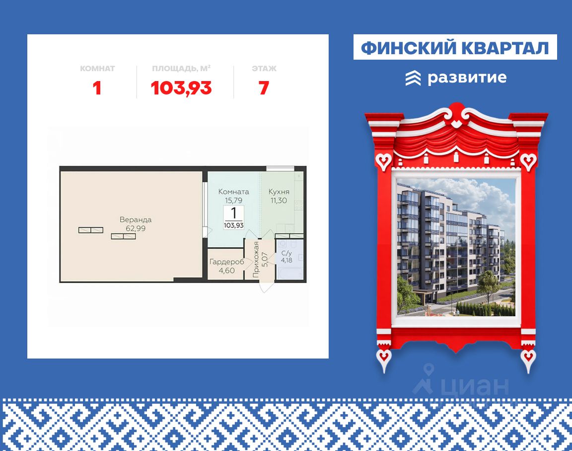"Продается квартира площадью 103.93 кв. м с предчистовой отделкой. Квартира расположена на 7 этаже 7 этажного дома, в жилом комплексе комфорт-класса "Финский Квартал".