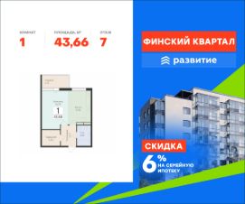 Продается квартира площадью 43.66 кв. м с отделкой white box. Квартира расположена на 7 этаже 8 этажного дома, в жилом комплексе комфорт-класса "Финский Квартал".