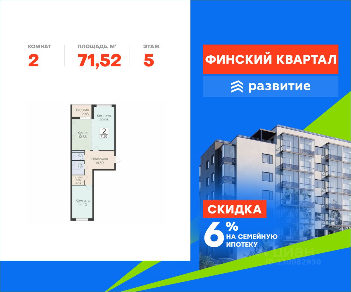 Продается квартира площадью 71.52 кв. м с отделкой white box. Квартира расположена на 5 этаже 8 этажного дома, в жилом комплексе комфорт-класса "Финский Квартал".