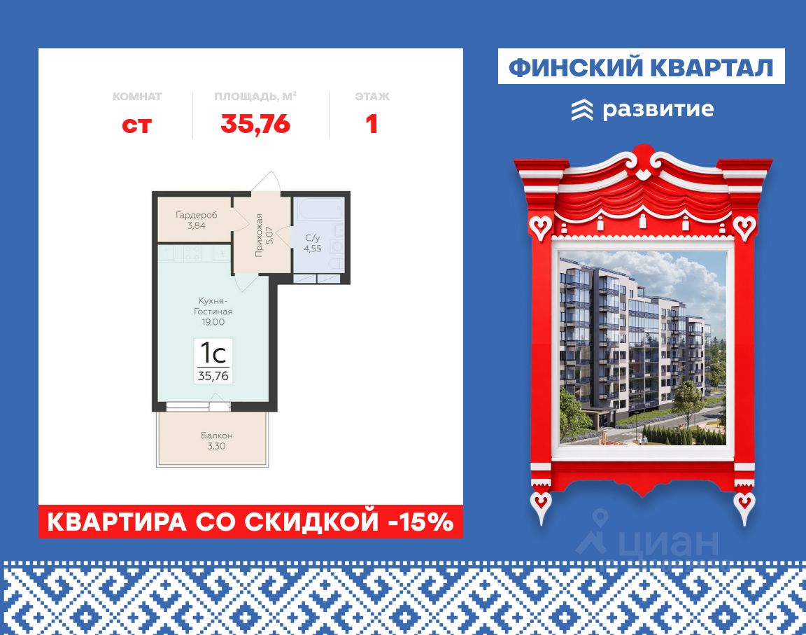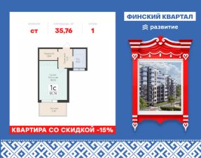 "Продается квартира площадью 35.76 кв. м с предчистовой отделкой. Квартира расположена на 1 этаже 8 этажного дома, в жилом комплексе комфорт-класса "Финский Квартал".