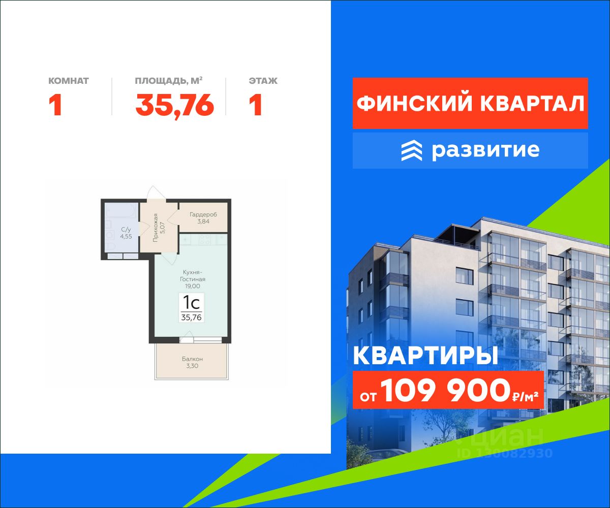 Продается квартира площадью 35.76 кв. м с отделкой white box. Квартира расположена на 1 этаже 7 этажного дома, в жилом комплексе комфорт-класса "Финский Квартал".