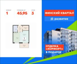 Продается квартира площадью 45.95 кв. м с отделкой. Квартира расположена на 3 этаже 7 этажного дома, в жилом комплексе комфорт-класса "Финский Квартал".