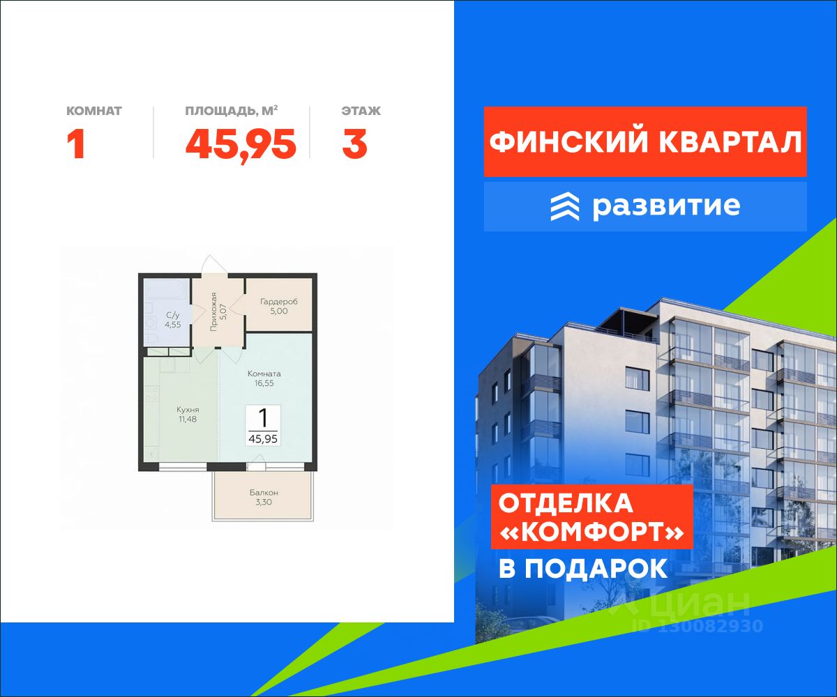 Продается квартира площадью 45.95 кв. м с отделкой. Квартира расположена на 3 этаже 8 этажного дома, в жилом комплексе комфорт-класса "Финский Квартал".