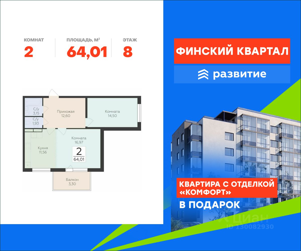 Продается квартира площадью 64.01 кв. м с отделкой. Квартира расположена на 8 этаже 8 этажного дома, в жилом комплексе комфорт-класса "Финский Квартал".