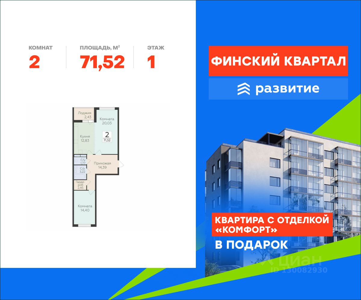 Продается квартира площадью 71.52 кв. м без отделки. Квартира расположена на 1 этаже 8 этажного дома, в жилом комплексе комфорт-класса "Финский Квартал".