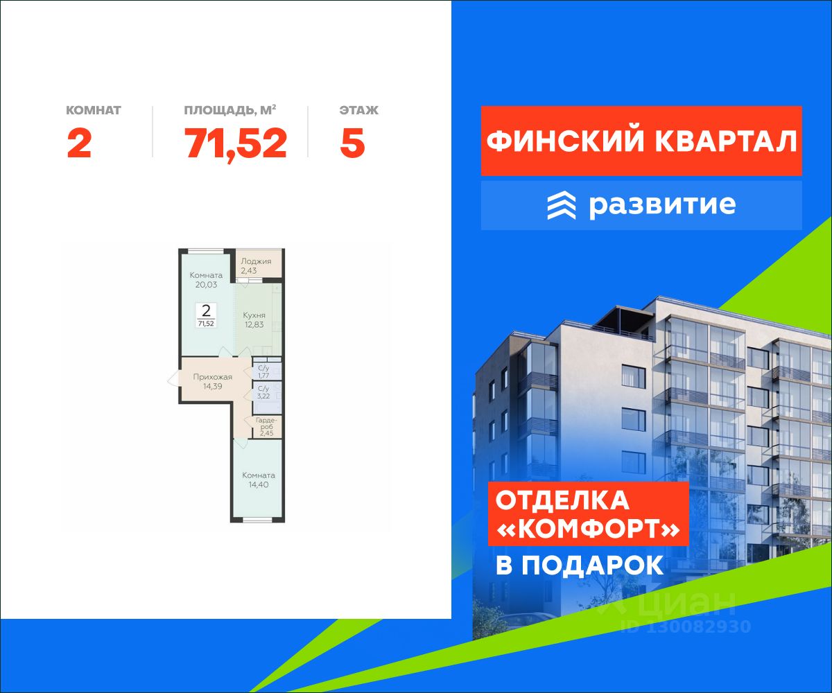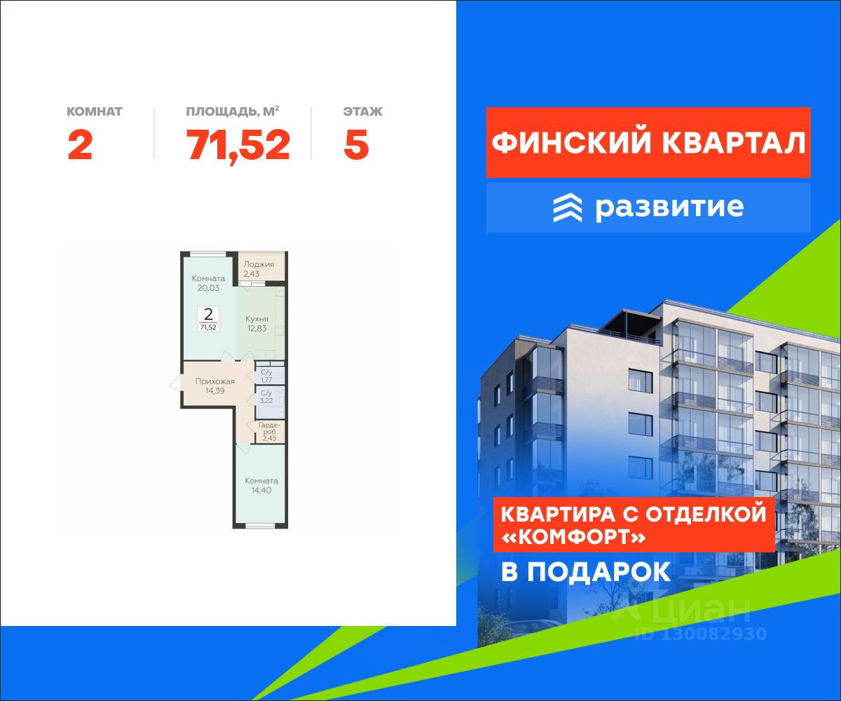 Продается квартира площадью 71.52 кв. м с отделкой. Квартира расположена на 5 этаже 7 этажного дома, в жилом комплексе комфорт-класса "Финский Квартал".