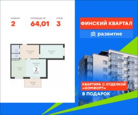 Продается квартира площадью 64.01 кв. м без отделки. Квартира расположена на 3 этаже 8 этажного дома, в жилом комплексе комфорт-класса "Финский Квартал".