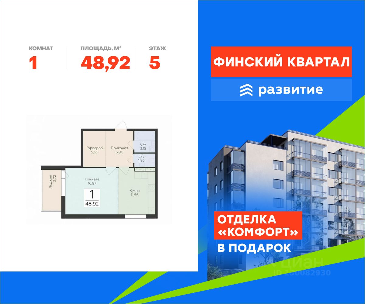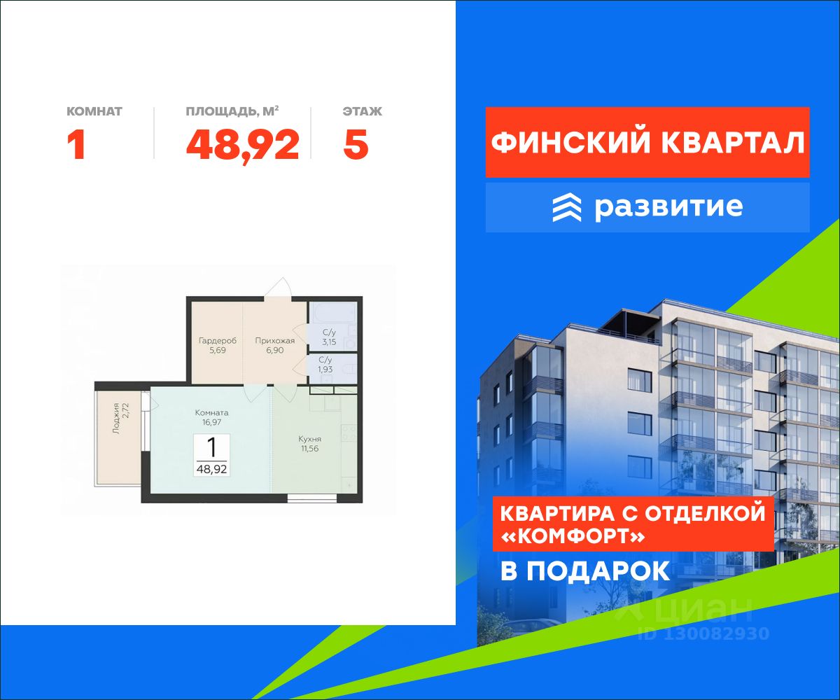 Продается квартира площадью 48.92 кв. м с отделкой. Квартира расположена на 5 этаже 7 этажного дома, в жилом комплексе комфорт-класса "Финский Квартал".